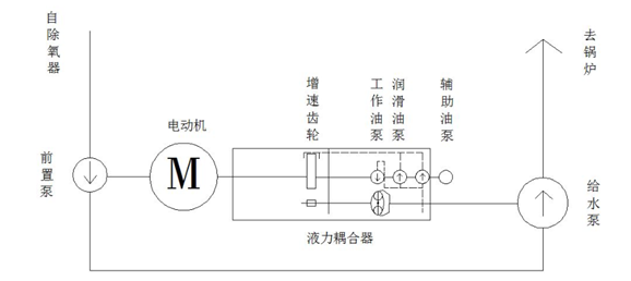 系统由前置泵、电动机、液力偶合器(包含工作油路、润滑油路部分)、给水泵组成,系统根据机组负荷变化,通过液力偶合器调节给水泵供水量的大小,以满足锅炉生产系统供水量的需要。