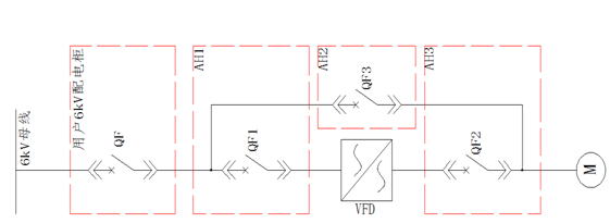 QF1为变频器输入断路器,QF2为变频输出断路器,QF3为工频旁路断路器;