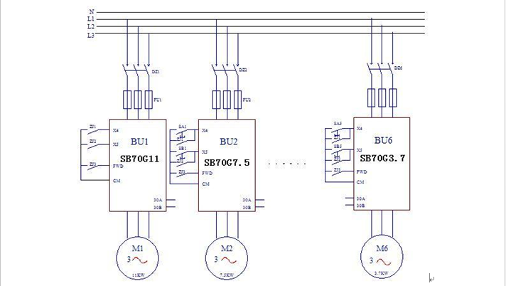 本例以分部传动点为6个点的1092为例加以说明。图2中,各传动点的电机功率分别为:网部11kW,压榨7.5kW,烘1~烘2均为5.5kW,压光3.7kW,卷纸3.7kW。纸机的负载为恒转矩负载和大惯性负载,选用388vip太阳集团SB70G系列变频器,速度的调节用变频器的端子X4、X5用以设定频率。在X4、X5端口上,接有按钮和中间继电器常开节点,按钮SA1~SA5本级速度上升微调;SB1~SB5本级速度的下降微调;ZJ1总速度上升;ZJ2总速度下降;ZJ3总起/总停,这又是一种速度链的分配方式。