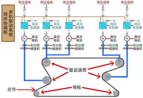 长距离输送皮带机多数采用多滚筒驱动,多台电机驱动同一滚筒时,由于滚筒及减速机齿轮等机械设备在制造过程中存在误差,且长距离皮带机由于地形、皮带与滚筒之间的包络角不同等原因,皮带在头部及尾部拉进力度并不完全一致,加上驱动滚筒的电机的电气参数也有一定差异,不可避免的会出现力矩不同步问题。速度快的电机将承受较重负载,速度慢的电机将被拖动,在减速时更容易造成被拖动电机处于发电状态,造成设备报过压故障而停机。为确保皮带机系统的运输能力及安全运行,应保证皮带机机头与机尾的各滚筒同步启停,保证各滚筒之间的功率平衡。