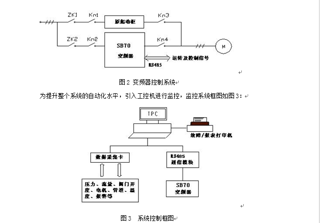 模拟量数据采集卡将压力、流量、阀门开度、电机温度和管道温度等模拟信号转换成12位的数字信号,每一路信号占用数据采集卡上一个模拟通道,互不影响,采样周期为300ms。SB70变频器支持RS485半双工串行通讯方式,通过在工控机上用IP函数或VB的MSCDMM通讯控件编制串行通讯程序,即可实现工控机与变频器之间的通讯,本系统用VB的通讯控件编制。将采集到的数据信号,经实时分析处理后,通过组态王监控画面,监测现场传输的实时数据和历史数据及设备的运行状况、历史曲线的分析、实时报表、历史报表的打印、声光报警等。