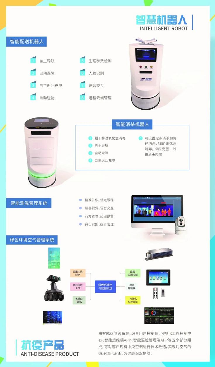 机器人产品是解决方案中最具智能化的高科技产品,凭借集团长期的智能制造技术沉淀,推出智慧测温机器人、智慧巡检防疫机器人、智慧配送机器人等系列,还可实现与空调N95的AI智能联动。