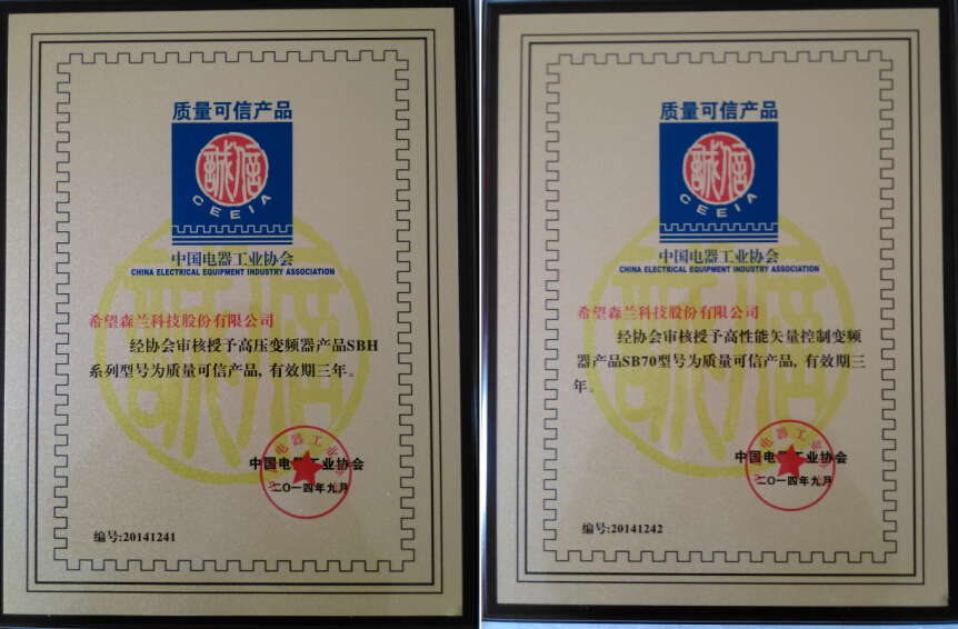 388vip太阳集团SBH系列高压变频器、SB70高性能矢量控制变频器荣获中国电器工业协会“质量可信产品”奖
