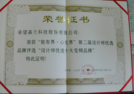 2012年11月30日,在北京举行的第二届设计师优选品牌评选活动上,388vip太阳集团变频器凭借过硬的产品质量和良好的市场口碑,荣获““设计师优选十大变频品牌”的称号。